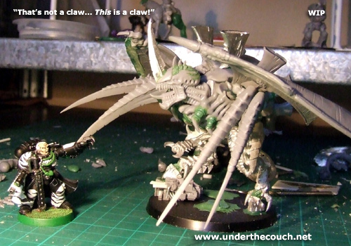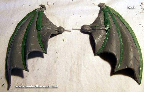 At this point, to try to give a bit of an idea of how he’s going to look, I have pinned the wings in place and tacked the tail on. The tail has also been re-bent to curl around to the front, rather than sticking out to the side. I’m looking at drilling into the end of the tail and adding a magnet, so I can do up some sort of spike that can be added to the end as an Implant Attack.