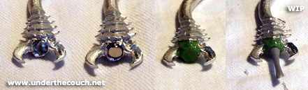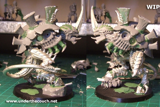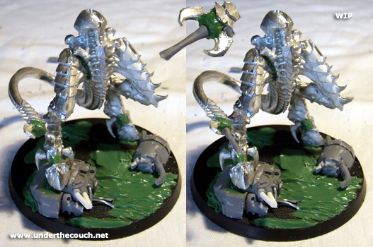 Next, I grabbed the Tyrant’s tail, drilled a hole in the tip, glued a small magnet in there, and puttied over it. The end result being a normal looking tail to which the spike can be attached. So now, he has a nice pointy bit that can be rammed into his target, with the claws on either side to hold it in place while he injects whatever unpleasantness he has stored up in there.