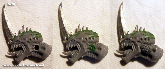Then I took the Tyrant’s head, and inserted a magnet on either side of the neck, puttied over in the usual fashion. This allows the glands to be attached on both sides, and removed when not in use. It’s not as huge and silly looking as the normal MC version, but should still be enough to show that they’re there.