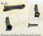 I took a small piece of plastic (the bottom of a Marine standard pole, actually) cut it into an organic spike sort of shape, with an angled and hollow end, like a syringe. I drilled a 1mm hole in the other end, and then a countersink hole with a 1.5mm drill bit.