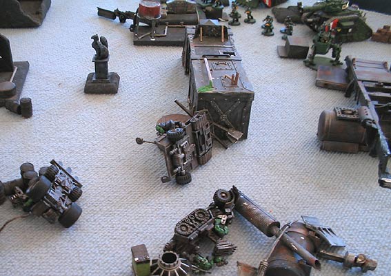 First turn saw the Waaagh surge rather turbidly across the board… Biglug’s trukk shot up the extreme left flank, aiming to get past a small cluster of buildings, ready to jump out and glare in a menacing fashion at the opposing infantry: