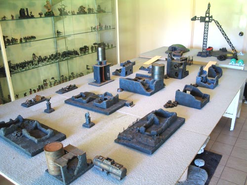 The board was to be an urban sprawl (my favorite) but given the size of the armies we had to improvise a little, and wound up dragging a couple of small bedside tables out into the gaming room to support an extra board. Then I proceeded to fill it up with as much urban terrain as I currently have finished off.