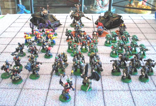 Appearing as suddenly as if they had just walked on from the edge of a board, a vast Chaos horde materialized on the outskirts of the ruined city. Their centre was held by black-armoured troops in filthy, slime-encrusted armour. Advancing (somewhat unsteadily) alongside them were strangely repellant marines in hideous purple and yellow armour. Out to either side were squads of pointy, dark-blue Traitor marines, and on the distant flanks were Red Corsairs and marines in strange shimmering green armour, backed up by putrid tanks spewing out noxious fumes, dropping stray armour plates and just generally lowering property values with their sheer ugliness…