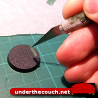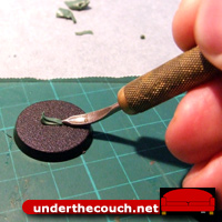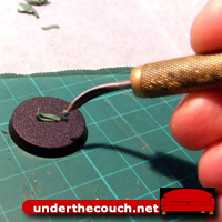 You’ll need the usual array of tools: some putty, a hobby knife, a sculpting tool (pictured here are a standard metal tool and a rubber-headed colour shaper, also sometimes called a wax carver), some waxed baking paper, and obviously something to sculpt the seal onto. You can sculpt them in place on the miniature, or sculpt them onto a flat surface and then when they’re set, peel them off and glue them in place.